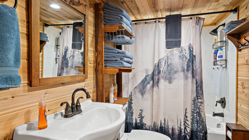 The bathroom features cedar walls and a subway-tiled bath/shower combo. We provide a hair dryer, shampoo, conditioner and body wash for your convenience.